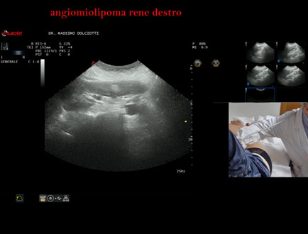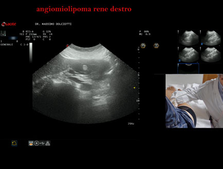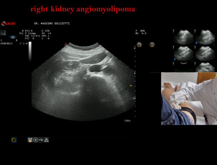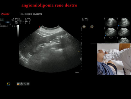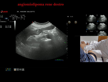 Data inserimento: 29 /05/2009Ecografia del: 09/05/2009 Strumento: Esaote MyLab25 Sonda: Convex 3,5 Mhz Età paziente: F 29 anni Motivazione dell' esame: diarrea cronica.Commento all'esame: le immagini, il video ed i fotogrammi della RM documentano angiomiolipoma renale dx. Realizzazione: Dr. Filippo Pizzicaroli - Roma Presentazione: Dr. Massimo Dolciotti - Ancona Elaborazione digitale: Andrea Dini - Ancona