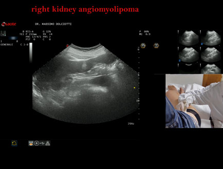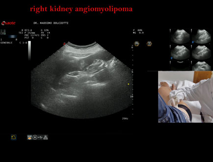 Data inserimento: 15 /02/2021Ecografia del: 12/02/2021 Strumento: Esaote MyLab Twice Sonda: Convex Multifrequenza 1-8 MHz Età Paziente: F 52 anni Motivazione dell'esame: riscontro occasionale. Commento all'esame: le immagini ed il video documentano 3 piccole neoformazioni iperecogene al rene destro, la maggiore delle dimensioni di 18,6x14,2 mm, da ricondurre ad angiomiolipomi. Conclusioni: 3 angiomiolipomi al rene destro (3 angiomyolipomas in the right kidney). Presentazione: Dr. Massimo Dolciotti - Ancona In collaborazione: Dr.ssa Anita Merani - Ancona Elaborazione digitale: Andrea Dini - Ancona