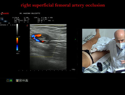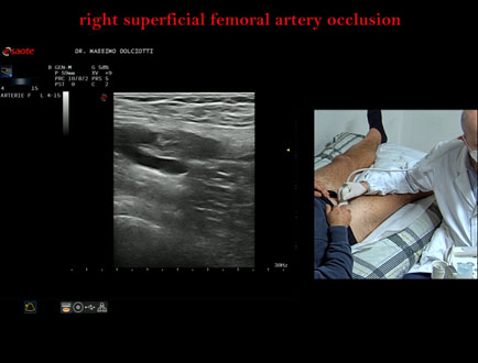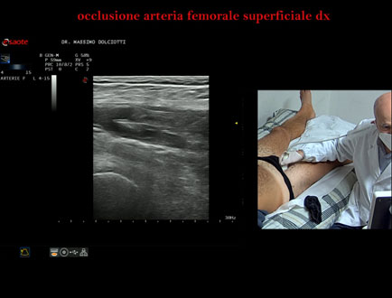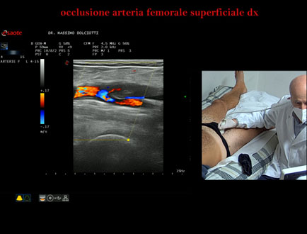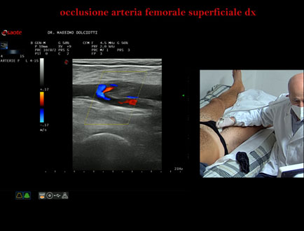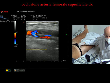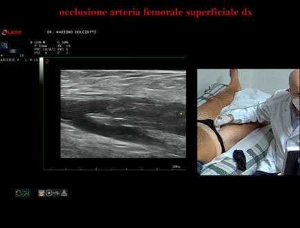 Data inserimento: 22 /10/2025Ecografia del: 13/10/2025 Strumento: Esaote MyLab Eight Sonda: Lineare Multifrequenza 4-15 MHz Età Paziente: M 42 anni Motivazione dell'esame: da 2-3 mesi dolore al polpaccio destro. Commento all'esame: le immagini ed il video documentano l'ostruzione completa dell'arteria femorale superficiale destra all'origine. Conclusioni: occlusione dell'arteria femorale superficiale destra all'origine (occlusion of the right superficial femoral artery at the origin). Presentazione: Dr. Massimo Dolciotti - Ancona Elaborazione digitale: Andrea Dini - Ancona