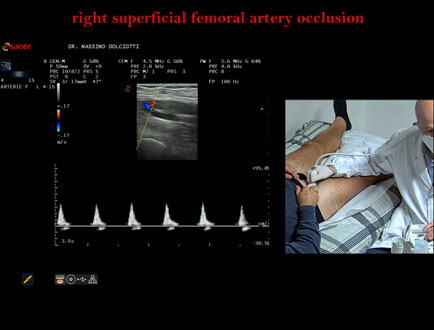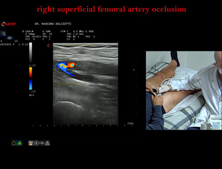 Data inserimento: 15 /01/2016Ecografia del: 24/11/2015 Strumento: Esaote MyLab 50 Gold Sonda: Lineare Multifrequenza 7,5-12 MHz e 12-18 MHz, Doppler Continuo CW 5 MHz Età Paziente: M 55 anni Motivazione dell'esame: claudicatio intermittens severa con autonomia di marcia di 200 metri. Paziente già sottoposto a stenting dell'asse iliaco destro per stenosi nel mese di febbraio 2014. Da tre mesi dolore all'arto inferiore destro e claudicatio. Commento all'esame: le immagini ed il video documentano su tutto l'asse arteriore dell'arto inferiore destro, flusso patologico con aspetto tardus-parvus per restenosi dello stenting precedentemente realizzato. Conclusioni: stenosi serrata intra-stent del tratto prossimale dell'arteria iliaca comune di destra, con flusso patologico tardus-parvus su tutto l'arto inferiore destro (stent stenosis of the proximal segment of the right common iliac artery, with flow tardus parvus pathological of the whole right leg). Presentazione: Dr. Massimo Dolciotti - Ancona Elaborazione digitale: Andrea Dini - Ancona