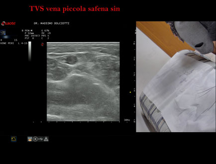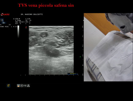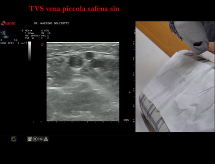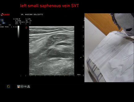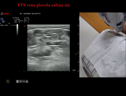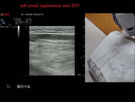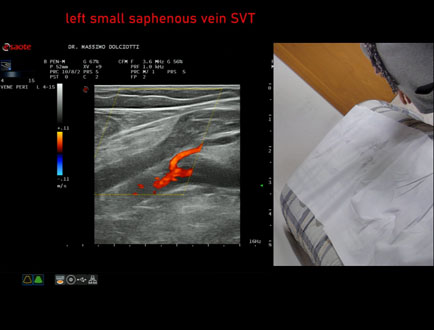Età Paziente: F 72 anni Motivazione dell'esame: da 4 settimane dolore alla gamba sinistra. Commento all'esame: le immagini ed il video documentano, alla vena piccola safena sinistra, trombosi venosa superficiale dal terzo inferiore fino a poco prima dalla giunzione safeno-poplitea. Conclusioni: trombosi venosa superficiale - TVS - della vena piccola safena sinistra (superficial vein thrombosis (SVT) of the left small saphenous vein). In collaborazione: Dr.ssa Marica Manfredi - Ancona, Dr. Ilir Qose - Ancona Presentazione: Dr. Massimo Dolciotti - Ancona Elaborazione digitale: Andrea Dini - Ancona