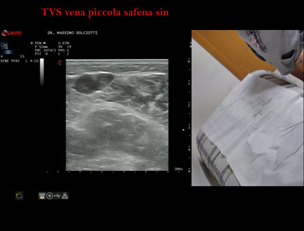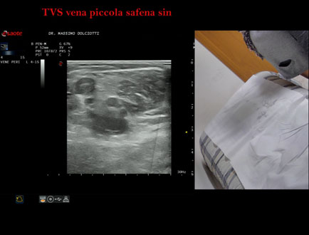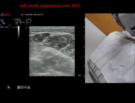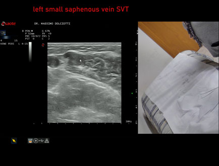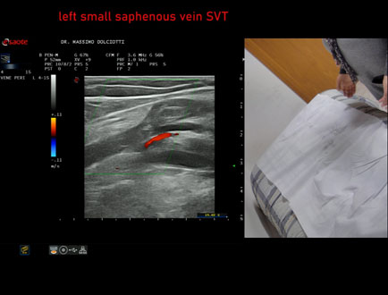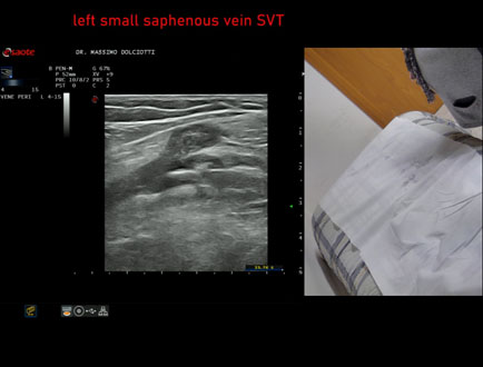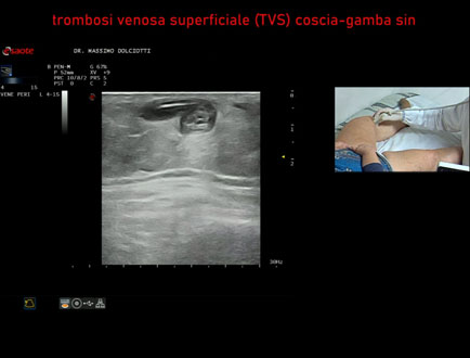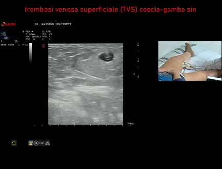 Età Paziente: F 81 anni Motivazione dell'esame: da 2 giorni dolore e tumefazione alla gamba destra Commento all'esame: le immagini ed il video documentano la presenza di Trombosi Venosa Superficiale (TVS) alla vena Grande Safena e varice di gamba destra, fino al terzo superiore di coscia. Conclusioni: Trombosi Venosa Superficiale (TVS) arto inferiore destro (Superficial Vein Thrombosis - SVT - of the right lower limb). Presentazione: Dr. Massimo Dolciotti - Ancona Elaborazione digitale: Andrea Dini - Ancona