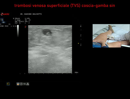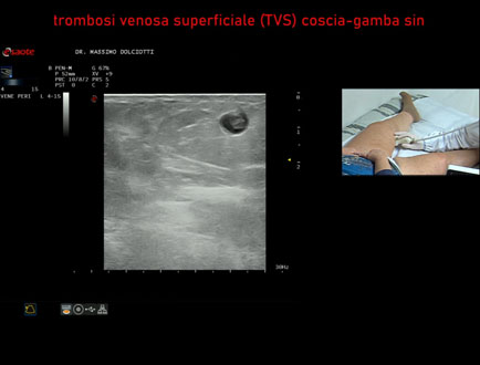 Età Paziente: F 80 anni Motivazione dell'esame: da 10 giorni dolore alla coscia sinistra Commento all'esame: le immagini ed il video documentano, la TVS (Trombosi Venosa Superficiale) di varice al terzo inferiore della coscia sinistra e TVS alla Vena Grande Safena sinistra al terzo superiore. Conclusioni: Trombosi Venosa Superficiale - TVS - varice e Vena Grande Safena - VGS - coscia sinistra (Superficial Vein Thrombosis - SVT - varicose vein and Great Saphenous Vein - GSV - left thigh). Presentazione: Dr. Massimo Dolciotti - Ancona Elaborazione digitale: Andrea Dini - Ancona