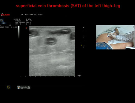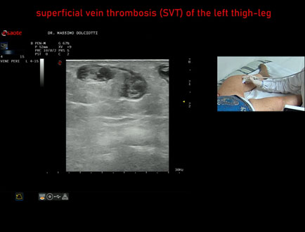 Età Paziente: F 81 anni Motivazione dell'esame: follow up per trombosi venosa superficiale Commento all'esame: le immagini ed il video documentano la presenza di Trombosi Venosa Superficiale (TVS) della vena Grande Safena destra, al terzo medio di coscia. Conclusioni: Trombosi Venosa Superficiale (TVS) della Grande Safena destra (Superficial Vein Thrombosis - SVT - and Deep Vein Thrombosis - DVT - of the right Great Saphenous vein). Presentazione: Dr. Massimo Dolciotti - Ancona Elaborazione digitale: Andrea Dini - Ancona