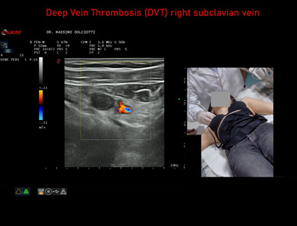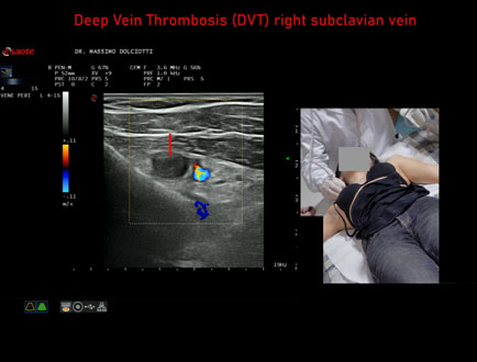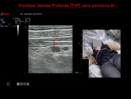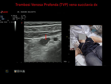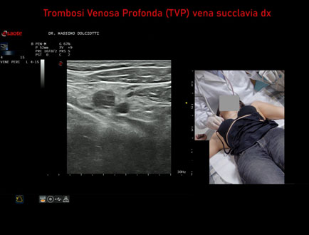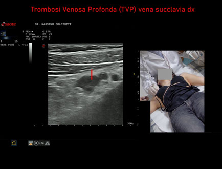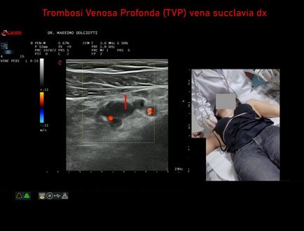Età Paziente: F 28 anni Motivazione dell'esame: dolore al cavo ascellare destro, edema del braccio destro e reticolo venoso all'emitorace destro. Commento all'esame: le immagini ed il video documentano la trombosi completa della vena succlavia destra. Conclusioni: Trombosi Venosa Profonda - TVP - della vena succlavia destra (Deep Vein Thrombosis - DVT - of the right subclavian vein). In collaborazione: Dr.ssa Marica Manfredi - Ancona, Dr. Ilir Qose - Ancona Presentazione: Dr. Massimo Dolciotti - Ancona Elaborazione digitale: Andrea Dini - Ancona