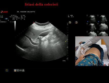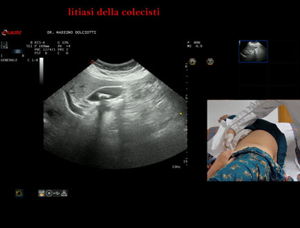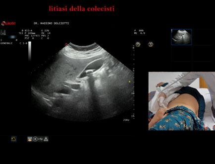 Data inserimento: 05 /03/2008Ecografia del: 07/06/2006 Strumento: Toshiba 380A Età paziente: F 33 anni Si esegue l'indagine ecografica per colica epatobiliare insorta da due giorni in paziente portatrice di litiasi della colecisti. Le immagini ed il video documentano la colecisti a pareti regolari, con evidenza nel suo lume di tre calcoli, di cui uno nell'infundibulo ed un secondo nella via biliare principale, che si presenta dilatata. Il calcolo di maggior dimensioni risulta essere di diametro di 13,5 mm., localizzato nel corpo della colecisti.Presentazione: Dr. Massimo Dolciotti - Ancona Elaborazione digitale: Andrea Dini - Ancona