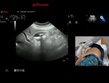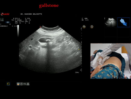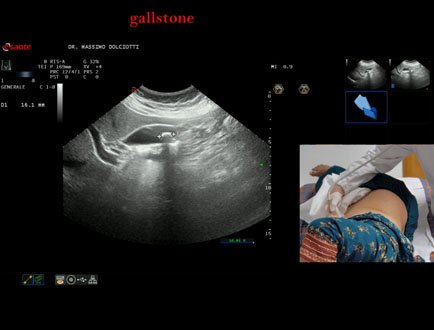 Data inserimento: 30 /11/2015Ecografia del: 29/12/2015 Strumento: Esaote MyLab 50 Gold Sonda: Convex Multifrequenza 2,5-6,6 MHz e 2,5-5 MHz Età Paziente: M 41 anni Motivazione dell'esame: follow up di litiasi della colecisti. Commento all'esame: le immagini ed il video documentano immagini iperecogena, con cono d'ombra posteriore, delle dimensioni di 17 mm, 13 mm, 13,4 mm, da ricondurre a litiasi della colecisti. Conclusioni: calcoli della colecisti (gallstones). Presentazione: Dr. Massimo Dolciotti - Ancona Elaborazione digitale: Andrea Dini - Ancona