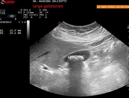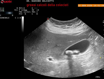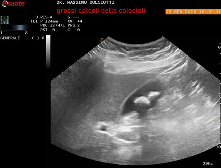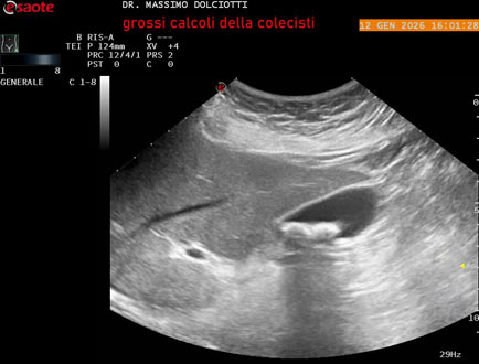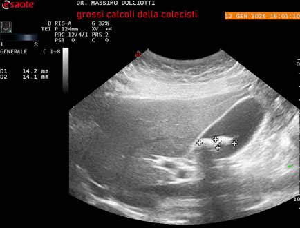 Età Paziente: F 45 anni Motivazione dell'esame: nicturia 1-2 volte. Commento all'esame: le immagini ed il video documentano nel lume della colecisti, due immagini iperecogene, con cono d'ombra posteriore, delle dimensioni di 20,9 mm e 15,7 mm, da ricondurre a litiasi multipla. Conclusioni: grossi calcoli della colecisti (large gallstones). In collaborazione: Dr.ssa Marica Manfredi - Ancona, Dr. Ilir Qose - Ancona Presentazione: Dr. Massimo Dolciotti - Ancona Elaborazione digitale: Andrea Dini - Ancona