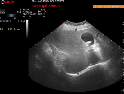 Età Paziente: M 43 anni Motivazione dell'esame:disuria e pollachiuria Commento all'esame: le immagini ed il video documentano alla colecisti, immagine iperecogena, con con d'ombra posteriore, delle dimensioni di 22,4 mm, da ricondurre a calcolo di grandi dimensioni. Conclusioni: grande calcolo della colecisti (large gallstone). Presentazione: Dr. Massimo Dolciotti - Ancona Elaborazione digitale: Andrea Dini - Ancona