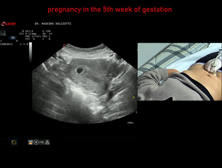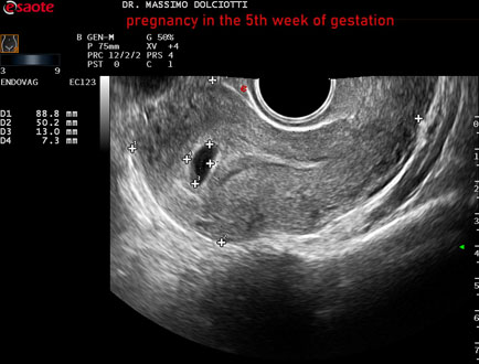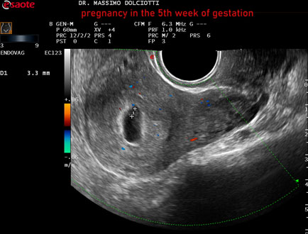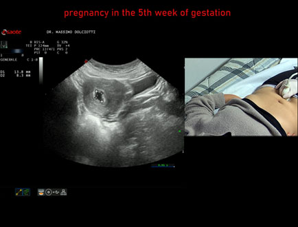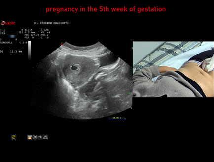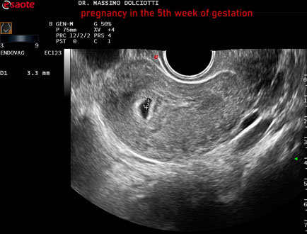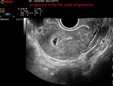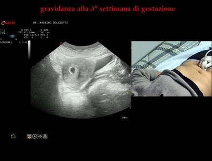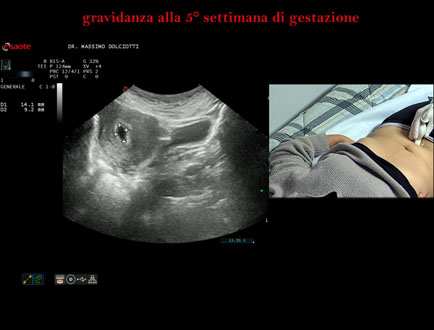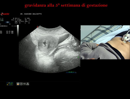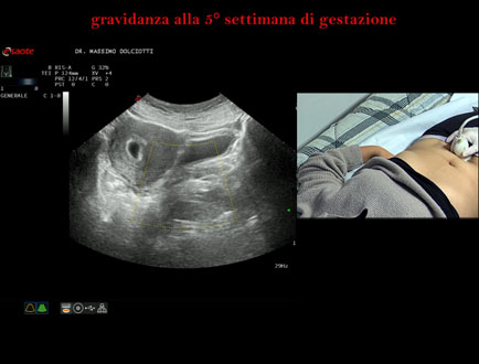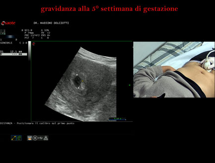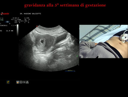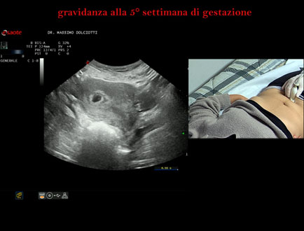 Età Paziente: F 28 anni Motivazione dell'esame: amenorrea e BETAHCG POSITIVO 17 mila. Commento all'esame: le immagini ed il video documentano la camera gestazionale delle dimensioni di 13 x 7 mm e presenza di sacco vitellino delle dimensioni di 3,3 mm. Conclusioni: gravidanza alla quinta settimana di gestazione (pregnancy in the 5th week of gestation). Presentazione: Dr. Massimo Dolciotti - Ancona Elaborazione digitale: Andrea Dini - Ancona