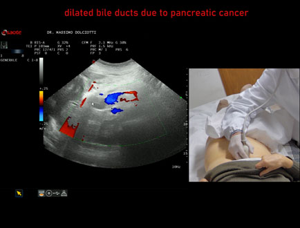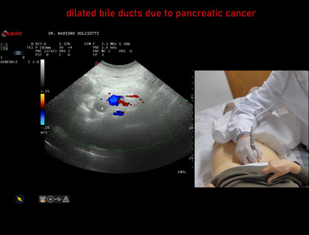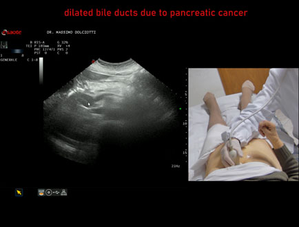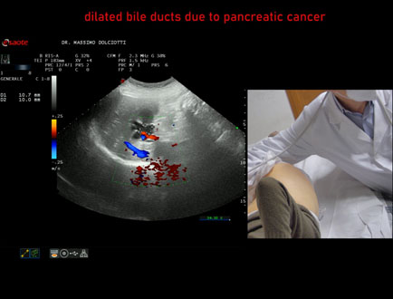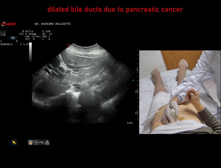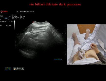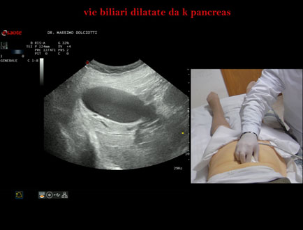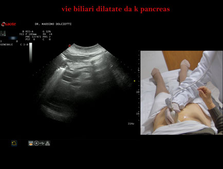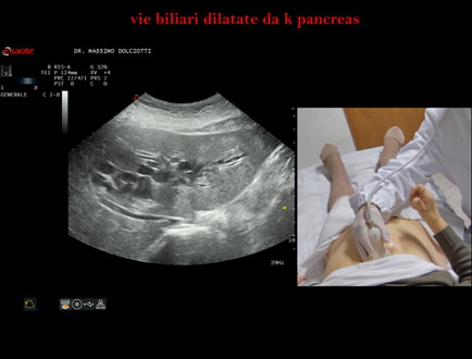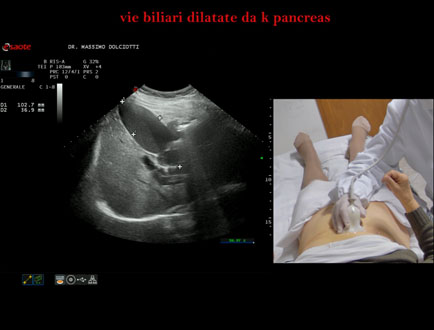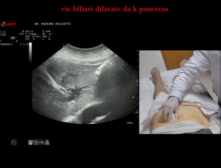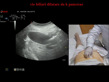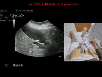 Età Paziente: F 77 anni Motivazione dell'esame: da 1 settimana urine scure, feci chiare e comparsa di ittero. Commento all'esame: le immagini ed il video documentano la dilatazione delle vie biliari intra ed extra epatiche, l'idrope della colecisti, la dilatazione del Wirsung. Conclusioni: K regione cefalica del pancreas (cancer of the cephalic region of the pancreas). Presentazione: Dr. Massimo Dolciotti - Ancona Elaborazione digitale: Andrea Dini - Ancona