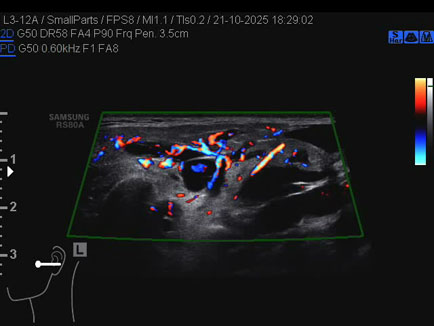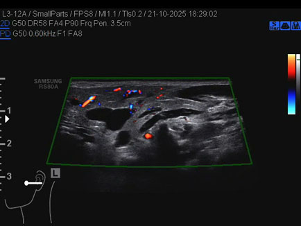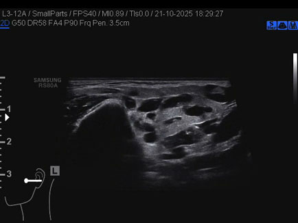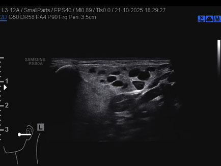 Data inserimento: 01/12/2025 Ecografia del: 21/10/2025 Strumento: Samsung Sonda: Lineare Età Paziente: 50 anni Commento all'esame: 50enne con stenosi del dotto di Stenone sn ed ectasia del dotto medesimo a dx. Conclusioni: stenosi del dotto di Stenone sinistro (left Stensen's duct stenosis). Realizzazione: Dr. F. Pietro Tarini - Gubbio (PG) Presentazione: Dr. Massimo Dolciotti - Ancona Elaborazione digitale: Andrea Dini - Ancona