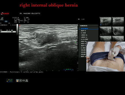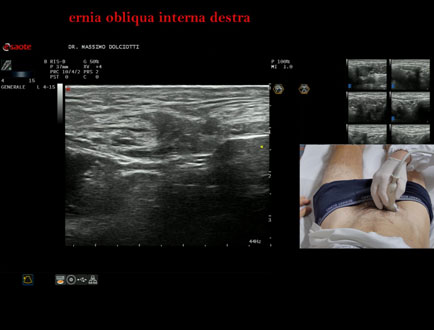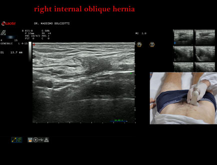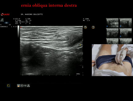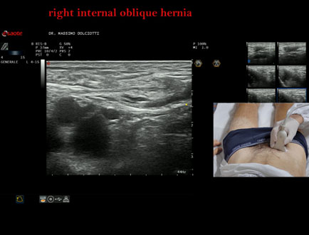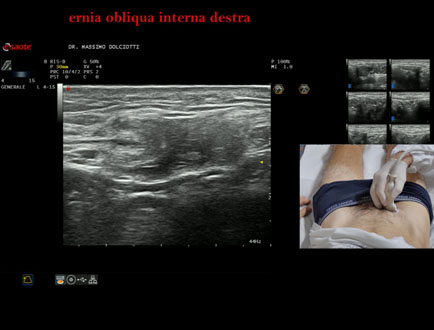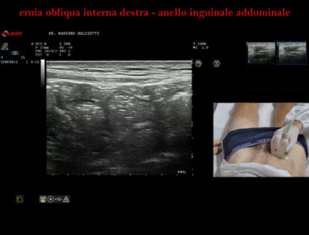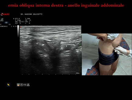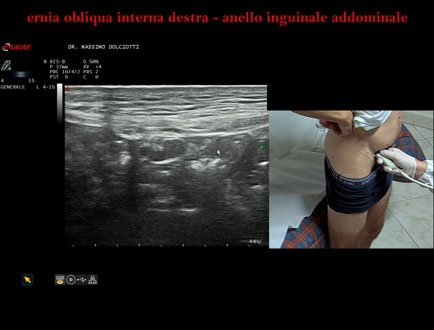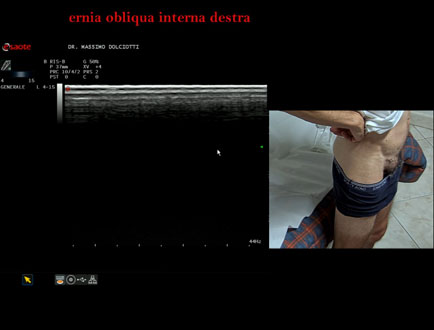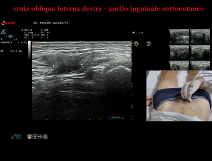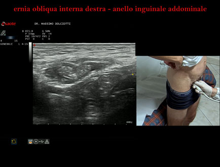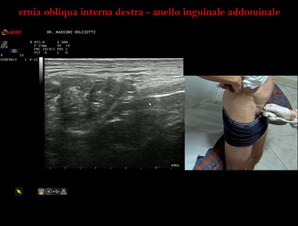 Età Paziente: M 48 anni Motivazione dell'esame:tumefazione inguine destro. Commento all'esame: le immagini ed il video documentano la presenza di ernia inguinale obliqua interna destra riducibile, con individuazione dell'anello inguinale sottocutaneo, anello inguinale addominale e canale inguinale. Conclusioni: ernia inguinale obliqua interna destra (right internal oblique inguinal hernia). Presentazione: Dr. Massimo Dolciotti - Ancona Elaborazione digitale: Andrea Dini - Ancona