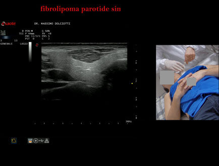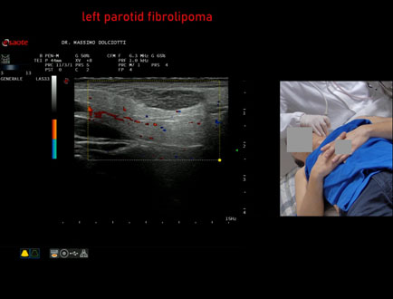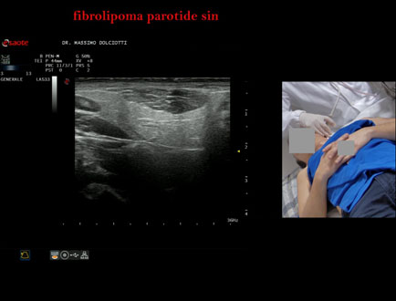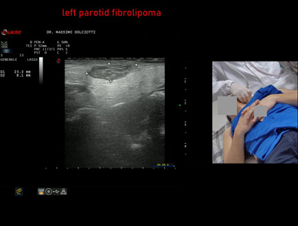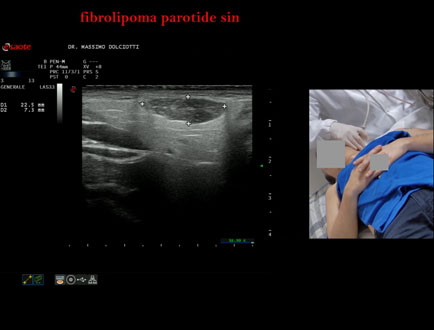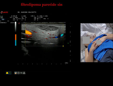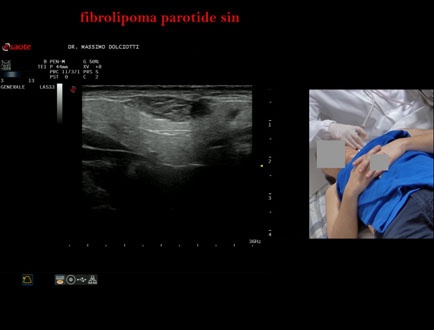 Età Paziente: M 56 anni Motivazione dell'esame: da alcuni mesi tumefazione parotidea sinistra non dolente. Commento all'esame: le immagini ed il video documentano formazione iso-ipoecogena, a margini definiti ma irregolari, delle dimensioni di 26 x 7 mm, senza evidenza di vascolarizzazione intra nodulare, da ricondurre, come prima ipotesi, a fibrolipoma, ma meritevole di approfondimento diagnostico. Conclusioni: fibrolipoma parotideo sinistro (left parotid fibrolipoma). Presentazione: Dr. Massimo Dolciotti - Ancona Elaborazione digitale: Andrea Dini - Ancona