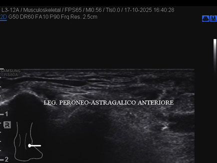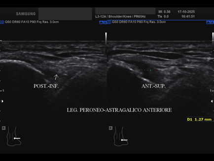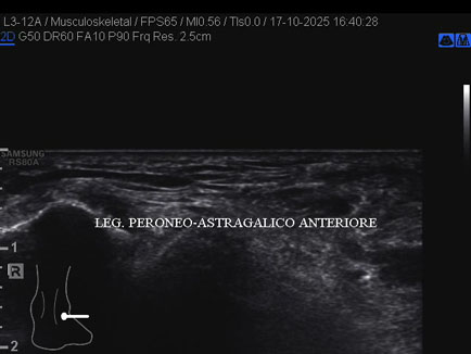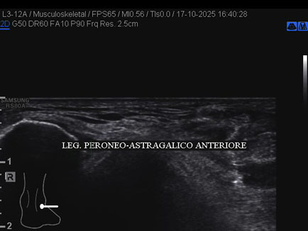 Data inserimento: 03/12/2025 Ecografia del: 17/10/2025 Strumento: Samsung Sonda: Lineare Età Paziente: M Commento all'esame: rottura del fascio antero-superiore del legamento fibulo-talare anteriore con integrità del fascio postero-inferiore in giovane calciatore. Conclusioni: rottura del fascio antero-superiore del legamento fibulo-talare anteriore destro (tear of the anterosuperior bundle of the right anterior talofibular ligament). Realizzazione: Dr. F. Pietro Tarini - Gubbio (PG) Presentazione: Dr. Massimo Dolciotti - Ancona Elaborazione digitale: Andrea Dini - Ancona