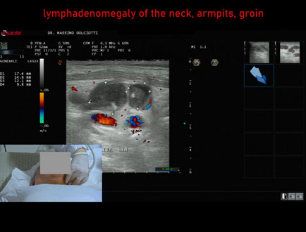 Età Paziente: M 68 anni Motivazione dell'esame: da 6 mesi tumefazione alla parotide destra. Commento all'esame: l’indagine eseguita con ecografo Esaote MyLab Eight e sonda lineare multifrequenza da 3-13 Mhz al collo documenta la PAROTIDE destra ad ecostruttura disomogenea per evidenza in sede centrale formazione ipoecogena pseudonodulare, a margini irregolari delle dimensioni di 45,3 x 30,7 mm con scarsissimi segnali di vascolarizzazione anche alla parotide sinistra formazione simile delle dimensioni minori di 33 x 20 mm. REGOLARI LE GHIANDOLE SALIVARI SOTTOMANDIBOLARI DESTRA E SINISTRA. Al 4° livello di sinistra della classificazione chirurgica dei linfonodi del collo si documentano linfoghiandole delle dimensioni di 12 x 7,8 mm, 7,2 x 7,8 mm, 6,8 x 5,7 mm, 7,7 x 4,9 mm, Al 2°-3° livello di sinistra linfonodi delle dimensioni aumentate 19,7 x 13,6 mm, 10,5 x 10,4 mm, 8,3 x 6,3 mm, 9,5 x 7,3 mm, 9,2 x 9,7 mm, 13 x 8,9 mm, al 4° livello di sinistra linfonodi delle dimensioni di 17 x 14,5 mm, 10,5 x 7,6 mm, 11,2 x 4 mm, 10,5 x 4,3 mm, 7,5 5 mm, al 5° livello B di sinistra linfonodi delle dimensioni di 27,6 x 10,5 mm, 12,1 x 7,2 mm, 20,6 x 10,9 mm, 17,4 mm x 14,6 mm, 12,1 x 9,8 mm, al 2°-3° livello di destra linfonodi delle dimensioni di 16,5 x 8,2 mm, 15,8 x 10,2 mm, 16,7 x 7,8 mm, al 5° livello B di dx linfonodo di 44 x 15 mm, Al 5° livello a di destra linfoghiandole delle dimensioni di 20 x 11 mm, 11 x 8 mm, 13 x 8 mm, al 4° livello di destra linfoghiandole delle dimensioni di 12 x 12 mm, 18 x 11 mm. In ascella destra linfoghiandole delle dimensioni di 18,8 x 8,7 mm, 17 x 12 mm, 17,1 x 9,2 mm. In ascella sinistra linfoghiandola delle dimensioni di 23 x 18 mm,. All' inguine destro linfoghiandola delle dimensioni di 46 x 33 mm all'inguine sinistro linfoghiandola delle dimensioni di 39 x 26 mm tutti i linfonodi segnalati hanno scarsissimi segnali di vascolarizzazione. Conclusioni: linfoadenomegalie al collo, ascelle ed inguine di natura ematologica (lymphadenomegaly in the neck, armpits and groin of haematological nature). Presentazione: Dr. Massimo Dolciotti - Ancona Elaborazione digitale: Andrea Dini - Ancona