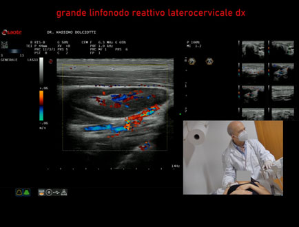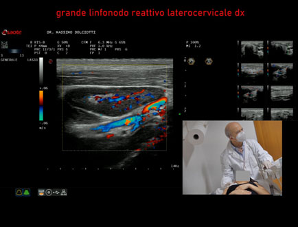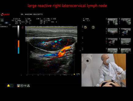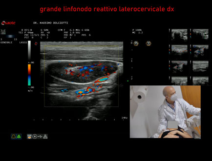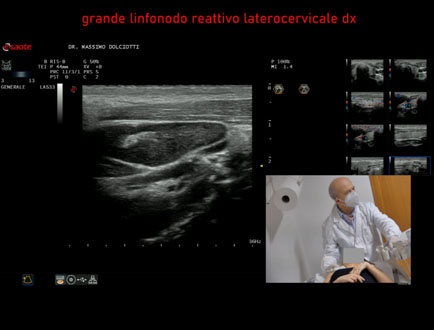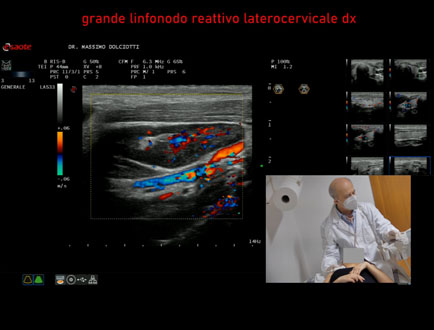Età Paziente: F 24 anni Motivazione dell'esame: da 7 giorni dolore e tumefazione laterocervicale destra. Commento all'esame: le immagini ed il video documentano linfonodo giugulo-digastrico destro di grandi dimensioni (40,3 x 12,7 mm), da ricondurre a linfonodo reattivo. Conclusioni: grande linfonodo reattivo laterocervicale destro (large right laterocervical reactive lymph node). In collaborazione: Dr.ssa Marica Manfredi - Ancona, Dr. Ilir Qose - Ancona Presentazione: Dr. Massimo Dolciotti - Ancona Elaborazione digitale: Andrea Dini - Ancona