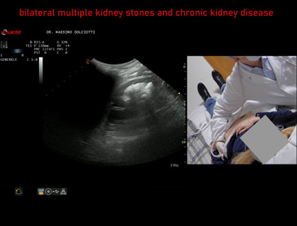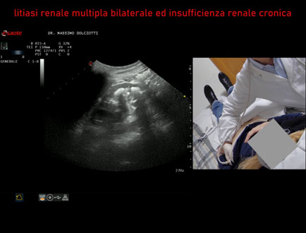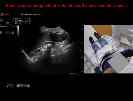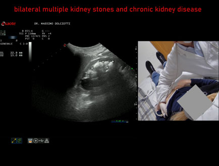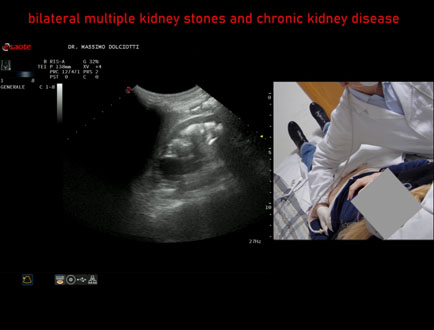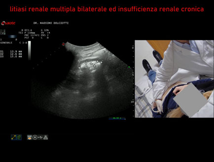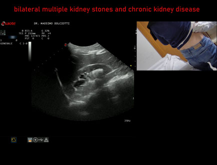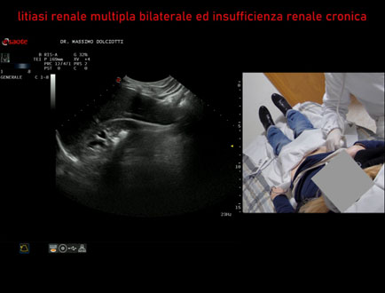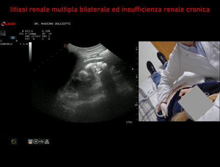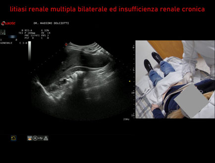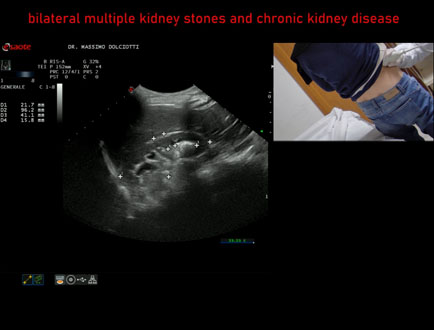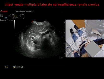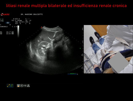 Età Paziente: F 56 anni Motivazione dell'esame: da 20 giorni dolori addominali, nausea, singhiozzo, inappetenza Commento all'esame: le immagini ed il video documentano la presenza di litiasi multipla al rene destro e sinistro. Conclusioni: litiasi renale multipla bilaterale ed insufficienza renale cronica (bilateral multiple kidney stones and chronic kidney disease). In collaborazione: Dr.ssa Marica Manfredi - Ancona, Dr. Ilir Qose - Ancona Presentazione: Dr. Massimo Dolciotti - Ancona Elaborazione digitale: Andrea Dini - Ancona