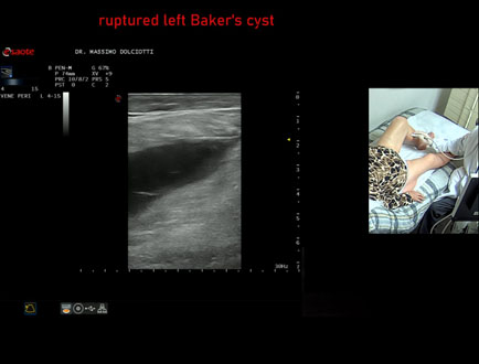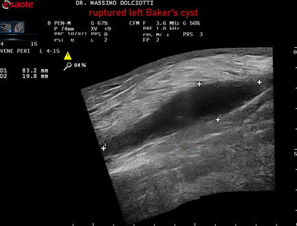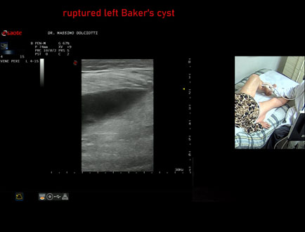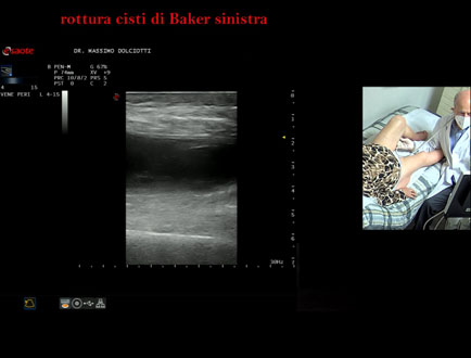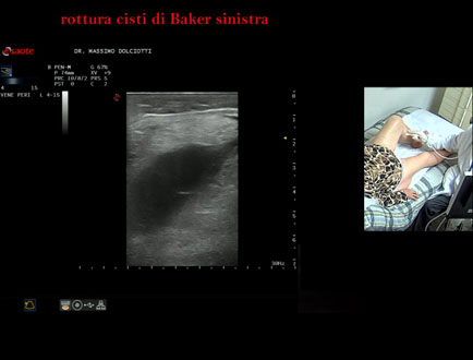 Età Paziente: F 51 anni Motivazione dell'esame: da 3 gg tumefazione e dolore al polpaccio sinistroi Commento all'esame: le immagini ed il video documentano formazione anecogena al cavo popliteo, che si estende fino al terzo medio del polpaccio sinistro, tra il gemello esterno e la fascia sottocutanea, da ricondurre a fluido proveniente dalla cisti di Baker. Conclusioni: rottura della cisti di Baker del ginocchio sinistro (Baker's cyst rupture of the left knee). Presentazione: Dr. Massimo Dolciotti - Ancona Elaborazione digitale: Andrea Dini - Ancona