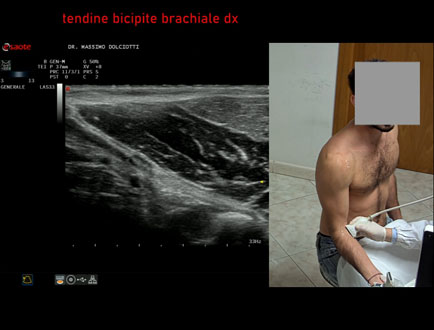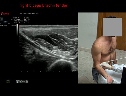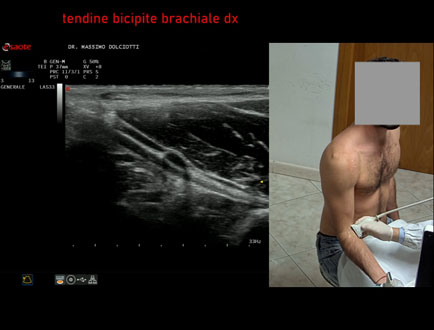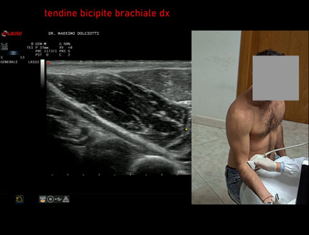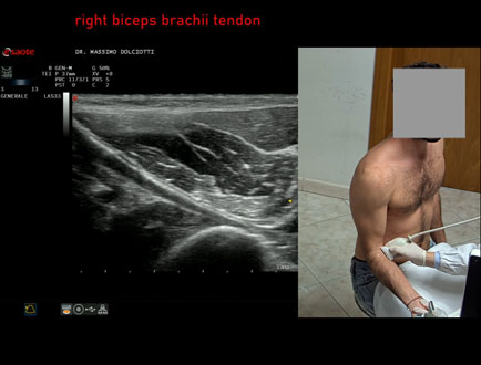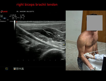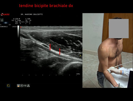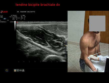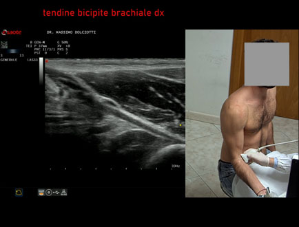 Età Paziente: M 30 anni Motivazione dell'esame: tecnica ecografica per lo stusio del tendine brachiale destro. Commento all'esame: le immagini ed il video documentano il tendine del muscolo bicipite brachiale destro distale e l'inserzione sul radio. Conclusioni: tecnica ecografica per lo studio del tendine del muscolo bicipite brachiale destro (ultrasound technique for the study of the tendon of the right biceps brachii muscle). In collaborazione: Dr.ssa Marica Manfredi - Ancona, Dr. Ilir Qose - Ancona Presentazione: Dr. Massimo Dolciotti - Ancona Elaborazione digitale: Andrea Dini - Ancona