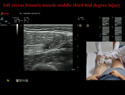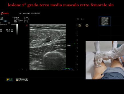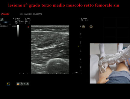 Data inserimento: 03 /10/2025Ecografia del: 24/09/2025 Strumento: Esaote MyLab Eight Sonda: Lineare Multifrequenza 3-13 MHz e 4-15 MHz, Età Paziente: M 37 anni Motivazione dell'esame: da 1 mese dolore al quadricipite sinistro. Commento all'esame: le immagini ed il video documentano la lesione di 2° grado, delle dimensioni di 33 x 10 mm, al terzo medio del muscolo retto femorale di sinistra. Conclusioni: lesione di secondo grado al terzo medio del muscolo retto femorale sinistro (second-degree injury in the middle third of the left rectus femoris muscle). Presentazione: Dr. Massimo Dolciotti - Ancona Elaborazione digitale: Andrea Dini - Ancona