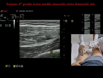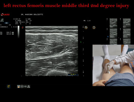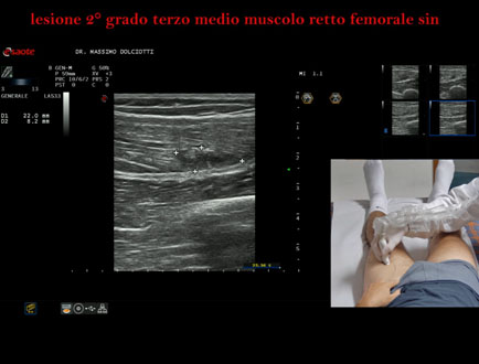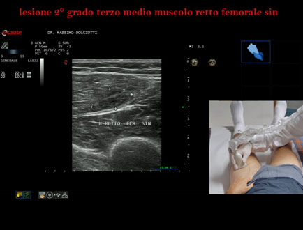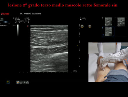 Data inserimento: 29 /04/2014Ecografia del: 18/04/2014 Strumento: Esaote MyLab 50 Gold - Responsabile Linea Cardio Esaote Regione Marche Dr. Franco Fabi Sonda: Lineare Multifrequenza 7,5-12 MHz Età Paziente: M 18 anni Motivazione dell'esame: una settimana fa prima della fine della partita di calcio per prendere una palla alta ha avvertito dolore alla regione posteriore della coscia destra. Commento all'esame: l'indagine ecografica con sonda lineare multifrequenza da 7,5-12 Mhz a livello posteriore della coscia destra nel muscolo semitendinoso in sede miotendinea si documenta area disomogenea delle dimensioni 42 mm di lunghezza per uno spessore di 21 mm da ricondurre a lesione (strappo) muscolare di secondo grado con lieve versamento sieroematico intramuscolare. Si allegano 12 (dodici) immagini indispensabile il follow up, la valutazione ortopedica-fisiatrica, del fisioterapista e clinica del medico curante. Conclusioni: strappo muscolare di secondo grado in sede miotendinea nel muscolo semitendinoso destro (right semitendinosus muscle injury). Potete esprimere le vostre osservazioni e commenti sul BLOG. Presentazione: Dr. Massimo Dolciotti - Ancona Elaborazione digitale: Andrea Dini - Ancona