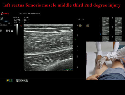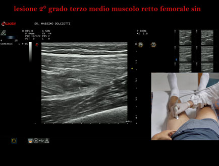 Data inserimento: 30 /11/2016Ecografia del: 05/11/2016 Strumento: Esaote MyLab 50 Gold Sonda: Lineare Multifrequenza 7,5-12 MHz Età Paziente: M 32 anni Motivazione dell'esame: da 3 settimane dolore alla coscia sinistra in sede posteriore occorsogli durante l'allenamento di calcio a 5. Commento all'esame: l'indagine ecografica con sonda lineare multifrequenza da 7,5 -12 Mhz a livello dei muscoli posteriori della coscia sinistra documenta nel muscolo semitendinoso sinistro in sede prossimale area disomogenea, ipoanecogena delle dimensioni di 48 x 18 mm, misura ottenuta per asse lungo o longitudinale da ricondurre a lesione muscolare di secondo grado con lieve raccolta sieroematica intramuscolare. Non versamento intermuscolare. Conclusioni: lesione muscolare di secondo grado del muscolo semitendinoso sinistro (left semitendinosus muscle injury second degree). Presentazione: Dr. Massimo Dolciotti - Ancona Elaborazione digitale: Andrea Dini - Ancona