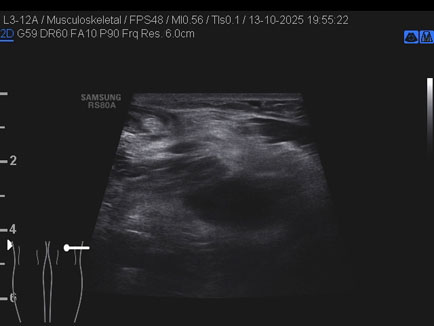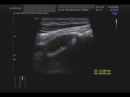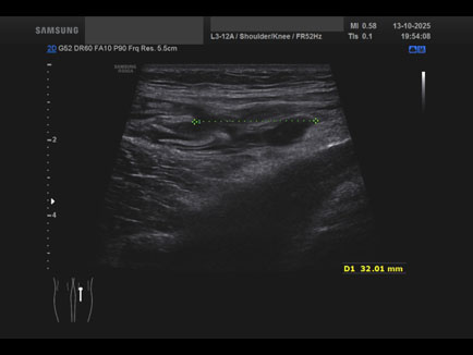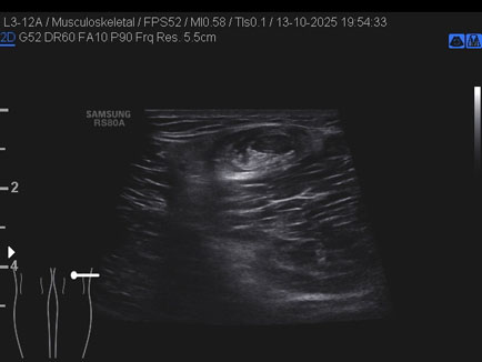 Data inserimento: 16/10/2025 Ecografia del: 13/10/2025 Strumento: Samsung Sonda: Lineare Età Paziente: Commento all'esame: giovane atleta con referto di RMN che riporta cisti del semimembranoso/gemello e falda fluida lungo il gemello mediale medesimo. Conclusioni: lesione e cisti del muscolo semitendinoso destro (right semitendinosus muscle injury and cyst). Realizzazione: Dr. F. Pietro Tarini - Gubbio (PG) Presentazione: Dr. Massimo Dolciotti - Ancona Elaborazione digitale: Andrea Dini - Ancona