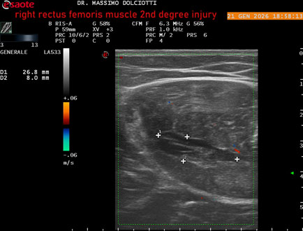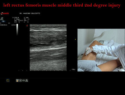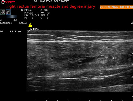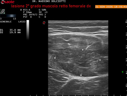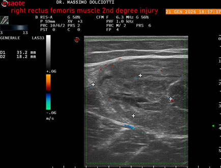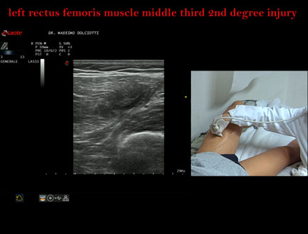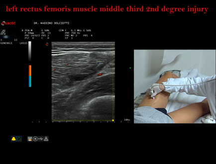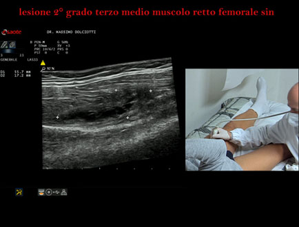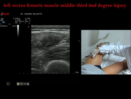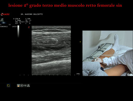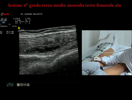 Età Paziente: M 34 anni Motivazione dell'esame: da 10 giorni comparsa di dolore alla coscia sin in sede anteriore. Commento all'esame: le immagini ed il video documentano la lesione di 2° grado, delle dimensioni di 58 x 17 mm, al terzo medio del muscolo retto femorale di sinistra. Conclusioni: lesione di secondo grado al terzo medio del muscolo retto femorale sinistro (second-degree injury in the middle third of the left rectus femoris muscle). Presentazione: Dr. Massimo Dolciotti - Ancona Elaborazione digitale: Andrea Dini - Ancona