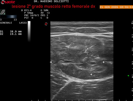 Data inserimento: 04 /01/2016Ecografia del: 02/01/2016 Strumento: Esaote MyLab 50 Gold Sonda: Lineare Multifrequenza 7,5-12 MHz Età Paziente: M 28 anni Motivazione dell'esame: da circa 40 gg dolore alla regione anteriore della coscia dx insorto durante l'allenamento di calcio con un forte tiro al pallone. Commento all'esame: l'indagine ecografica con sonda lineare multifrequenza da 7,5 -12 Mhz a livello anteriore della coscia destra documenta nel muscolo retto del quadricipite destro in sede medio-distale, formazione disomogenea, ipoecogena delle dimensioni di 24 x 19 mm misura ottenuta per asse corto e di 53,4 mm per uno spessore di 15,6 mm misura ottenuta per asse lungo o longitudinale, da ricondurre a lesione (strappo) muscolare di secondo grado con lieve raccolta sieroematica intramuscolare, quadro ecografico di lesione muscolare in via di parziale cicatrizzazione. Si allegano 6 (sei) immagini. Indispensabile il follow up, la valutazione ortopedica-fisiatrica, del fisioterapista e clinica del medico curante. Conclusioni: lesione (strappo) muscolare di secondo grado al muscolo retto femorale destro (injury grade II of rectus femoris right). Presentazione: Dr. Massimo Dolciotti - Ancona Elaborazione digitale: Andrea Dini - Ancona