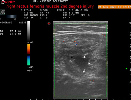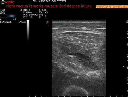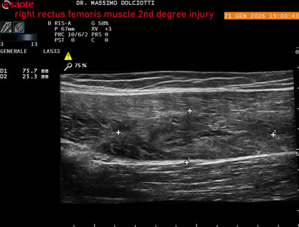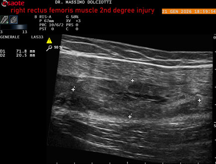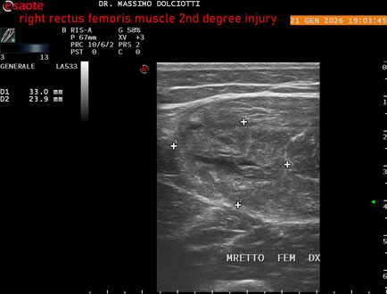 Età Paziente: M 23 anni Motivazione dell'esame: dolore al terzo prossimale della coscia destra da tre giornii. Commento all'esame: le immagini ed il video documentano, al terzo prossimale del muscolo retto femorale destro, area disomogenea, ipoecogena, delle dimensioni di 35 mm per uno spessore di 18 mm, misura ottenuta per asse corto o trasversale, e di 71 mm x 20 mm, misura ottenuta per asse lungo o longitudinale, da ricondurre a lesione muscolare di 2° grado con modica raccolta sieroematica intramuscolare. Conclusioni: lesione di 2° grado del muscolo retto femorale destro (2nd degree injury of the right rectus femoris muscle). In collaborazione: Dr.ssa Marica Manfredi - Ancona, Dr. Ilir Qose - Ancona Presentazione: Dr. Massimo Dolciotti - Ancona Elaborazione digitale: Andrea Dini - Ancona