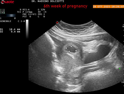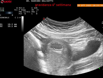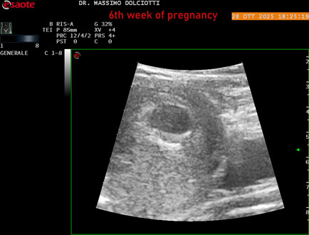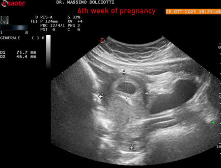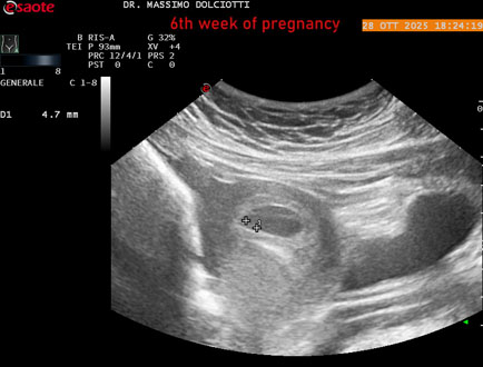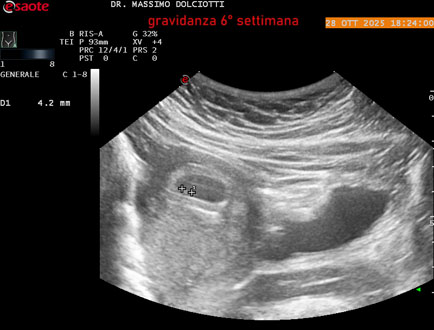Età Paziente: F 35 anni Motivazione dell'esame: amenorrea. Commento all'esame: le immagini ed il video documentano in utero il sacco gestazionale, il sacco vitellino e presenza di embrione delle dimensioni di 4,7 mm (CRL), con iniziale attività cardiaca, documentata nel video. Conclusioni: gravidanza alla 6° settimana di gestazione (pregnancy to the 6th week of gestation). Presentazione: Dr. Massimo Dolciotti - Ancona Elaborazione digitale: Andrea Dini - Ancona