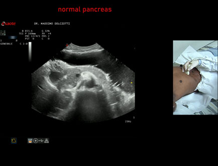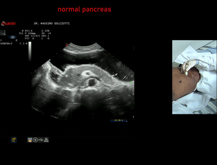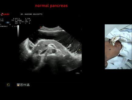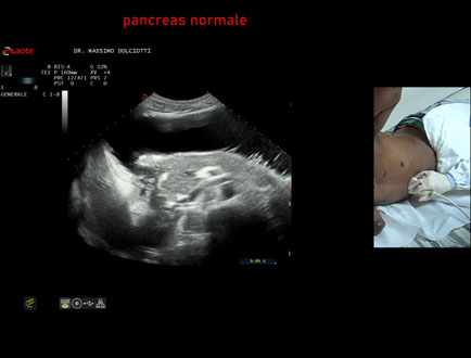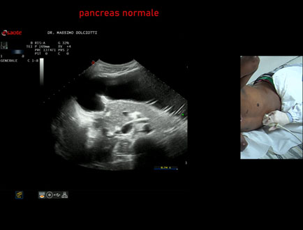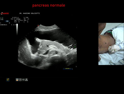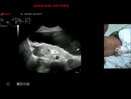 Età Paziente: F 43 anni Motivazione dell'esame: alvo alterno e pollachiuria. Commento all'esame: le immagini ed il video documentano il pancreas, con regione cefalica, corpo e coda, ad ecostruttura e morfovolumetria regolare, di normale aspetto ipoecogeno. Conclusioni: pancreas normale (normal pancreas). Presentazione: Dr. Massimo Dolciotti - Ancona Elaborazione digitale: Andrea Dini - Ancona
