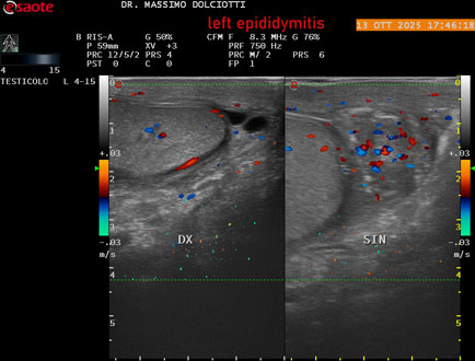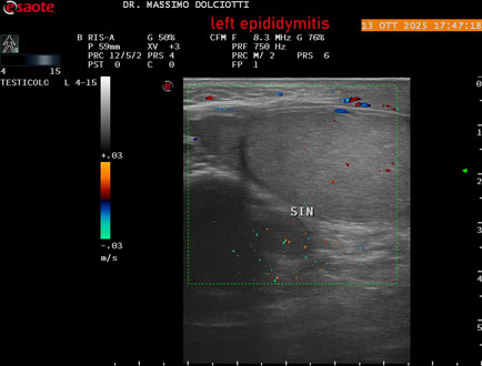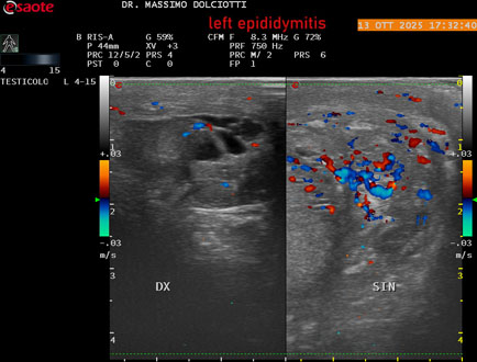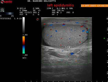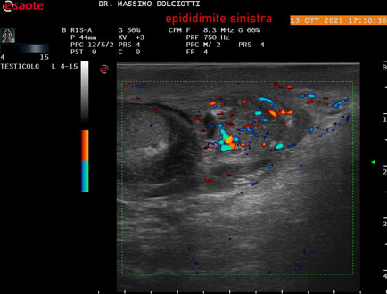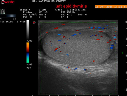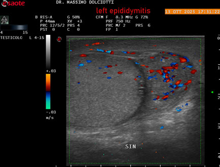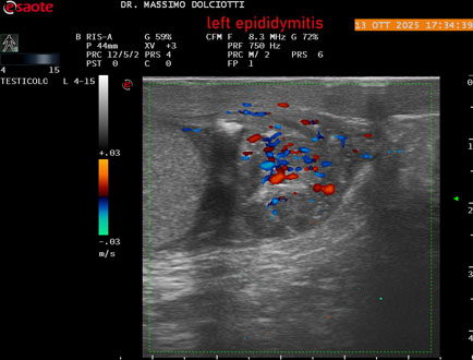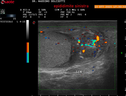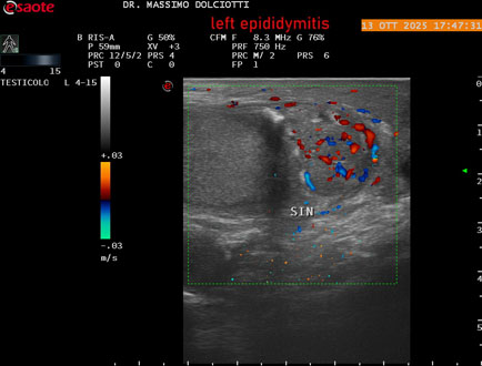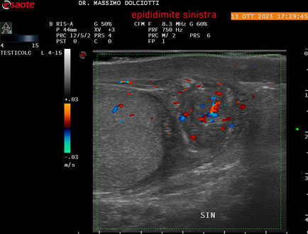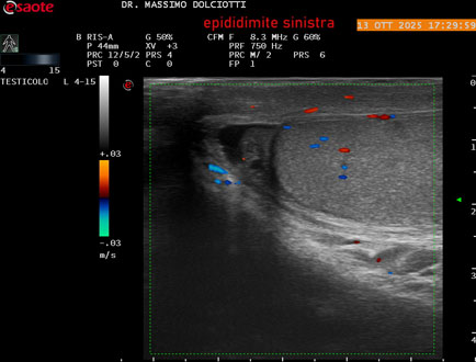 Data inserimento: 14 /10/2025Ecografia del: 13/10/2025 Strumento: Esaote MyLab Eight Sonda: Lineare Multifrequenza 4-15 MHz Età Paziente: M 70 anni Motivazione dell'esame: da 2 giorni dolore al testicolo sinistro. Commento all'esame: le immagini ed il video documentano l'epididimo sinistro spiccatamente aumentato di volume e di vascolarizzazione, come da flogosi. Didimo sinistro lievemente aumentato di volume. Quadro clinico ed ecografico da ricondurre ad epididimite acuta sinistra. Conclusioni: epididimite acuta sinistra (acute left epididymitis). Presentazione: Dr. Massimo Dolciotti - Ancona Elaborazione digitale: Andrea Dini - Ancona