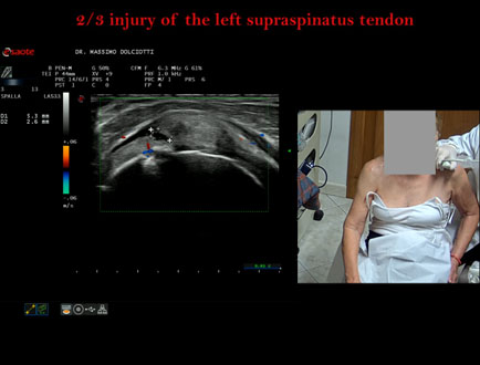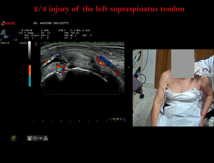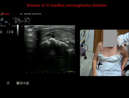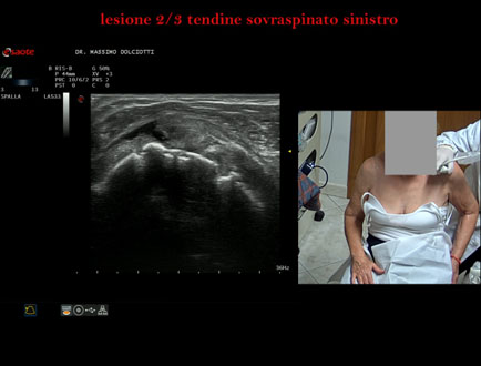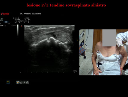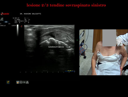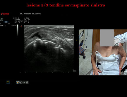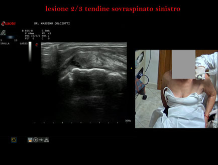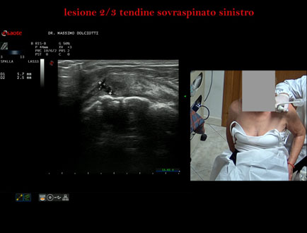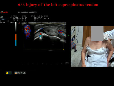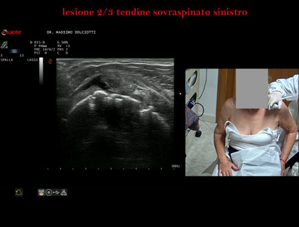 Età Paziente: M 32 anni Motivazione dell'esame: da 3 settimane dolore alla spalla sinistra, insorto dopo l'allenamento. Commento all'esame: le immagini ed il video documentano la lesione del tendine sovraspinoso sinistro, in sede prossimale, che interessa i 2/3 del tendine. Conclusioni: lesione 2/3 del tendine sovraspinato sinistro (2/3 lesion of the left supraspinatus tendon). Presentazione: Dr. Massimo Dolciotti - Ancona Elaborazione digitale: Andrea Dini - Ancona