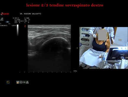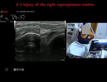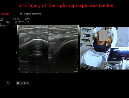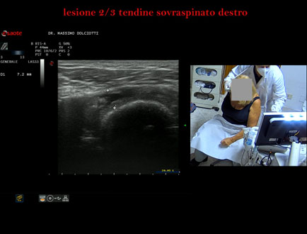 Età Paziente: F 76 anni Motivazione dell'esame: da 2 mesi dolore alla spalla destra anche la notte. Commento all'esame: le immagini ed il video documentano il tendine sovraspinato destro spiccatamente disomogeneo per evidenza, in sede medio prossimale, di area ipoecogena, delle dimensioni di 8,7 mm x 2,9 mm, da ricondurre a lesione parziale che interessa i 2/3 del tendine. Conclusioni: lesione 2/3 del tendine sovraspinato destro (2/3 injury of the left supraspinatus tendon). Presentazione: Dr. Massimo Dolciotti - Ancona Elaborazione digitale: Andrea Dini - Ancona