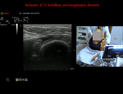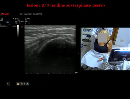Età Paziente: M 50 anni Motivazione dell'esame: da 1 mese dolore alla spalla destra Commento all'esame: le immagini ed il video documentano il tendine sovraspinato destro disomogeneo, con area ipoecogena in sede mediale, delle dimensioni di 9,4 x 3,3 mm, da ricondurre a lesione parziale ma che interessa i 2/3 del tendine. Conclusioni: lesione parziale di 2/3 del tendine sovraspinato destro (partial tear of 2/3 of the right supraspinatus tendon). Presentazione: Dr. Massimo Dolciotti - Ancona Elaborazione digitale: Andrea Dini - Ancona