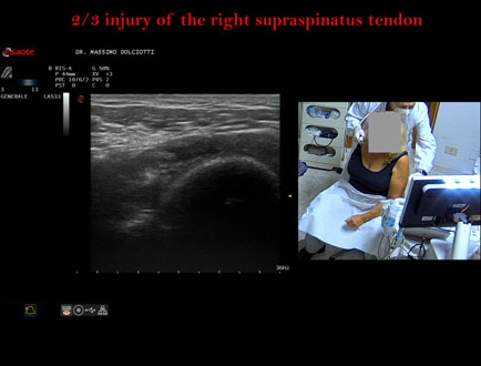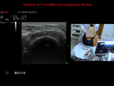 Data inserimento: 25 /03/2016Ecografia del: 19/06/2015 Strumento: Esaote MyLab 50 Gold Sonda: Lineare Multifrequenza 7,5-12 MHz e 3,5-10 MHz Età Paziente: F 76 anni Motivazione dell'esame: da un mese dolore alla spalla destra, il dolore è peggiorato nell'ultima settimana con impedimento a sollevare il braccio sopra la testa. Commento all'esame: le immagini ed il video documentano la lesione completa del tendine sovraspinato destro con versamento di fluido di moderata entità nella sua sede. Conclusioni: rottura completa del tendine sovraspinato destro (complete injury supraspinatus right tendon). Presentazione: Dr. Massimo Dolciotti - Ancona Elaborazione digitale: Andrea Dini - Ancona