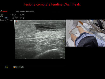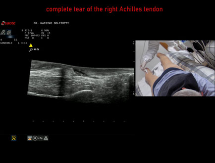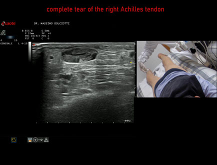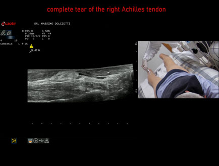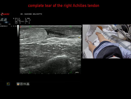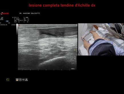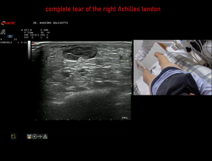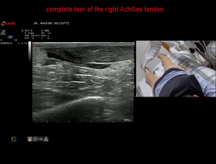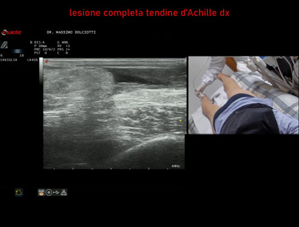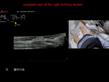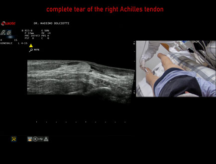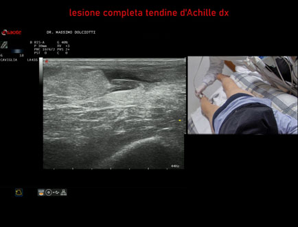 Età Paziente: M 71 anni Motivazione dell'esame: da 7 gg trauma distorsivo alla caviglia destra. Commento all'esame: le immagini ed il video documentano il tendine d'Achille destro spiccatamente disomogeneo, per lesione completa e versamento peritendineo. Conclusioni: lesione completa del tendine d'Achille destro (complete tear of the right Achilles tendon). In collaborazione: Dr.ssa Marica Manfredi - Ancona, Dr. Ilir Qose - Ancona Presentazione: Dr. Massimo Dolciotti - Ancona Elaborazione digitale: Andrea Dini - Ancona