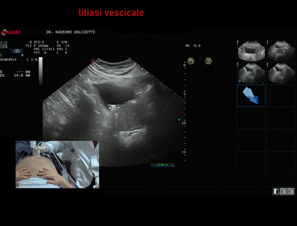 Età Paziente: M 62 anni Motivazione dell'esame: ematuria recidivantei Commento all'esame: le immagini ed il video documentano, a livello vescicale, immagine iperecogena, con cono d'ombra posteriore, delle dimensioni di 12,1 mm, mobile con il decubito, da ricondurre a litiasi vescicale. Conclusioni: litiasi vescicale (bladder stones). Presentazione: Dr. Massimo Dolciotti - Ancona Elaborazione digitale: Andrea Dini - Ancona